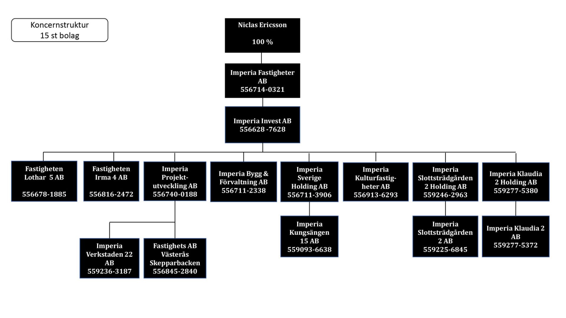Samtliga aktier i fastighetskoncernen Imperia innehas av grundaren Niclas Ericsson.